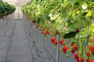 | いちご狩り いちごのビニールハウスが並んでいる。 |