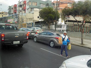 キトへ向かう。 | キトの街中へ 渋滞すると物売りが出没する。 |