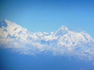 ヒマラヤ 左側の窓にはヒマラヤの高峰が 次々見える。右のピークがエベレストなの かな? |