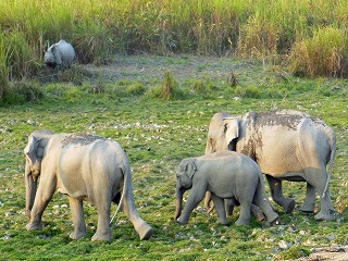 カジランガ国立公園 アジア最大の国立 公園・世界遺産。一カ所のゲート インドサイは2,700頭しか生息しないが、 カジランガには2,000頭いると言われる。 |