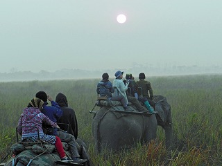 5時30分、まだ暗いうちからゾウに乗って サファリを楽しむ。インドサイが近い。 |