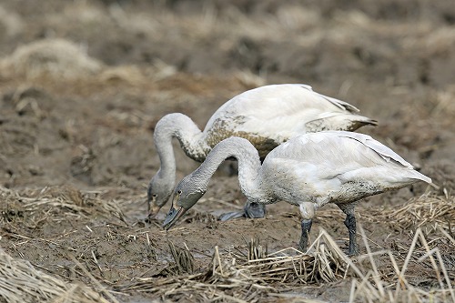 湖側には全く見られず、田圃で採餌中の100羽位の群を見つけた。。 |