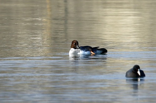 湖面が静かなためだろう、沖で泳いでいるものが多かった。。 |