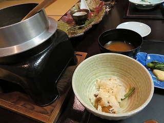 山菜釜飯 その場で炊いて即食べる。 腹いっぱいであまり食べられない。 |