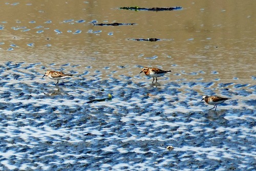 | 干潟で餌探しをしていることも多い。 | 干潟ではオバシギ、ソリハシシギと一緒に。 |