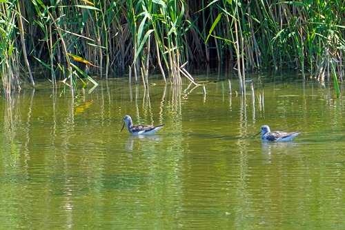 | エリマキシギが2羽。幼鳥。全長雄 26-32cm、雌 20-25cm |