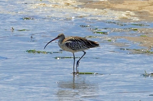 | 奥の個体は腰が褐色ぽい。 | 後ろを向くと褐色が目立ちホウロクシギ。全長 52-66cm |