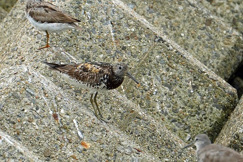 | 消波ブロックの上に成鳥夏羽。 | 成鳥夏羽の周りに幼鳥2羽集まって。全部で3羽。 |