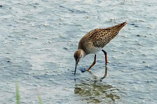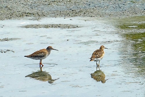 | エリマキシギは小さく見えるので幼鳥雌か。 手前にいるのはエリマキシギではなくて別種。 |
