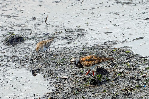 | 8月16日にいた胸が真っ黒で、肩羽が赤褐色の夏羽ほどでは ないが、胸がかなり黒い個体(手前)・ |
