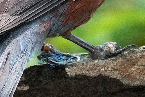 | 家の庭に来るイソヒヨドリが痛々しいことになっている。 | 拡大すると、右足にネットの糸らしいものが絡まっている。 左足はもっと沢山の糸が絡まっているようだ。 |