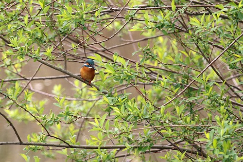 ヤナギの新緑の中で。近くで繁殖中らしい、エサ運び。