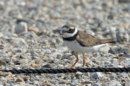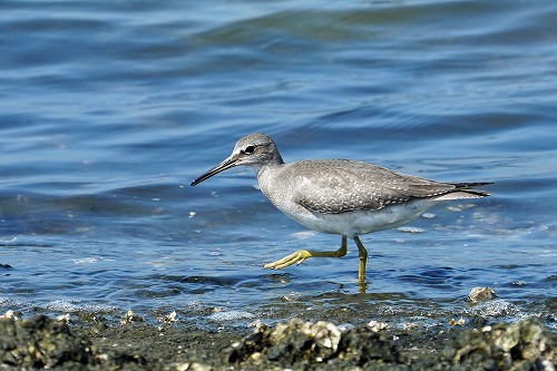採餌中。夏羽は黒い線と黄色の足が目立つ。