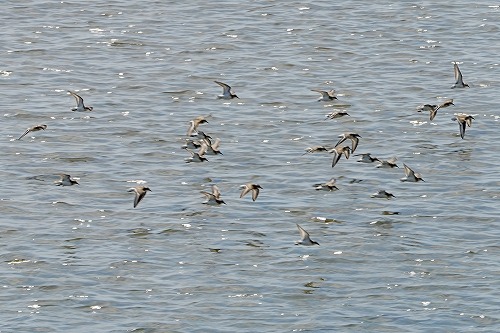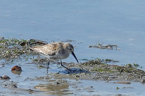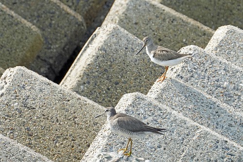 まだ夏羽。消波ブロック上でソリハシシギと一緒に。