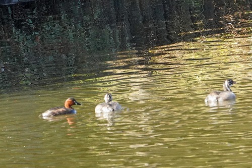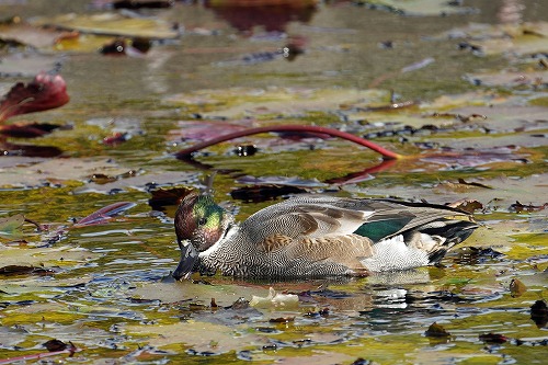 その下の池にコガモがいる。雄は換羽中、