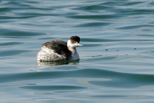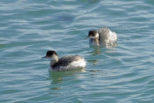 海に14羽の群が。雌は2羽のみ。