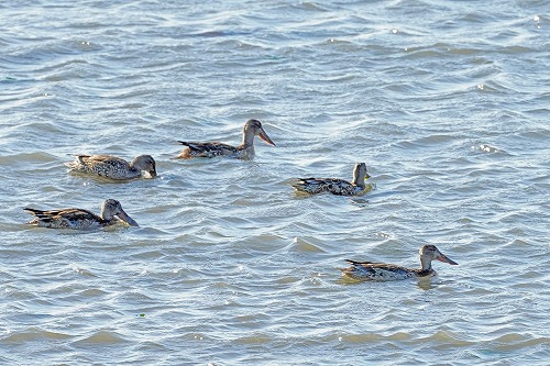 ハシビロガモ5羽、干潟にハマシギ。