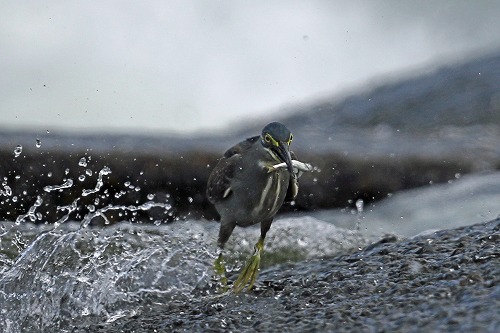 | 飛沫がかかるこの場所で頑張っているのは第1回夏羽の若鳥と思う。 背や雨覆に褐色味があり、下嘴に黄色味がある。 |