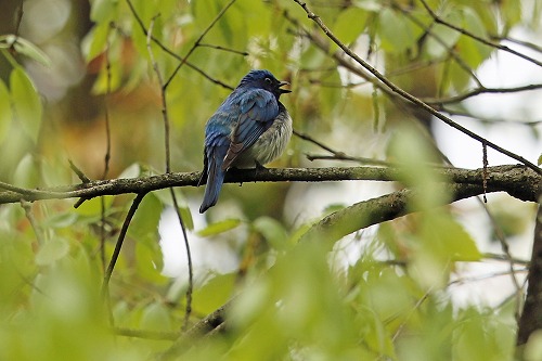 | 新緑の森に囀りが響き渡る。 | 渡来して間もない模様。枝移りしては囀り。 |