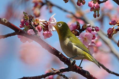 | 五分咲きの河津桜に、群が蜜を吸いに来ている。 | 嘴や顔の前部が花粉で黄色になっている。 |