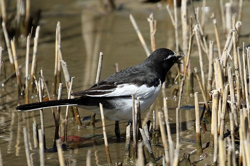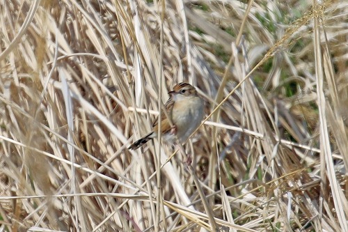 | ここでは枯草の上によくとまる。 | 3羽はいるが、行ったり来たりしてはっきりしない。 |