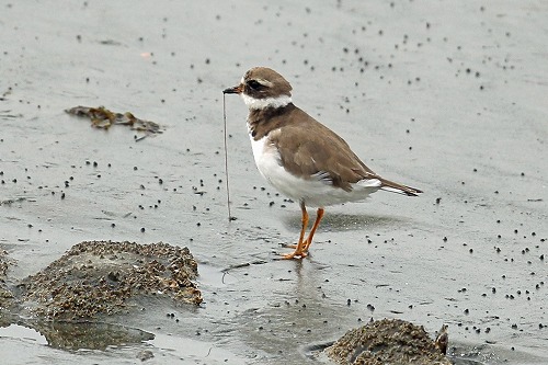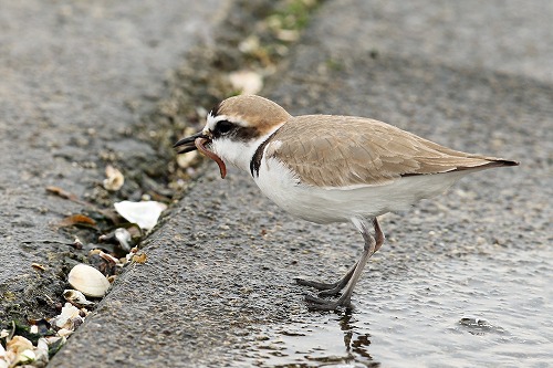 | 2羽で餌運びをしているが、雌雄を区別できない。 | 体色は地味で、銀色の足が目立つ。 |