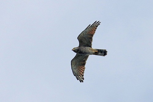 | 幼鳥か成鳥雌か?暗色型。曇り空を渡る。 青空が良いのだが。 |