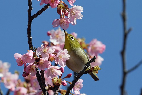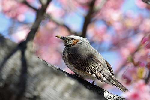 | 河津桜が8分咲き。ヒヨドリが蜜を吸いに来る。 | 嘴が花粉で黄色。全長 27-28.5cm |