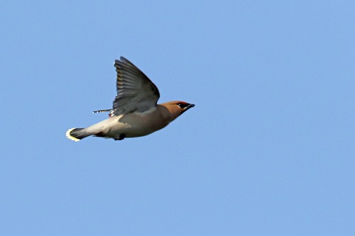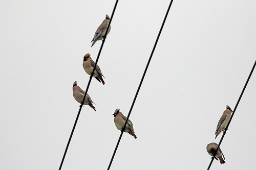 | キレンジャクも電線によくとまる。 群の中に少なくとも2羽いる。 |