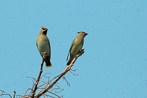ヒレンジャク(右)よりやはり大きく見える。 周りに埃の様に見えるのは、飛んで食べている虫。 |