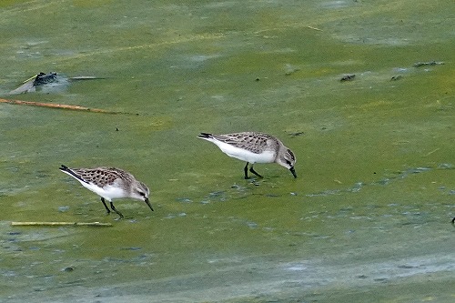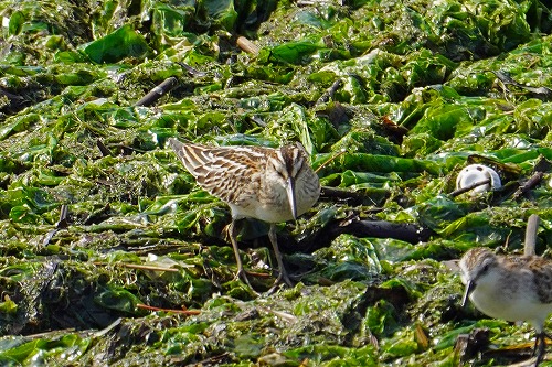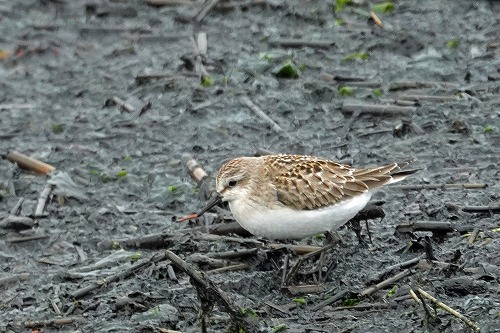 | 干潟に幼羽。全長 13-16cm | コチドリと一緒に、トウネン合計5羽。 |