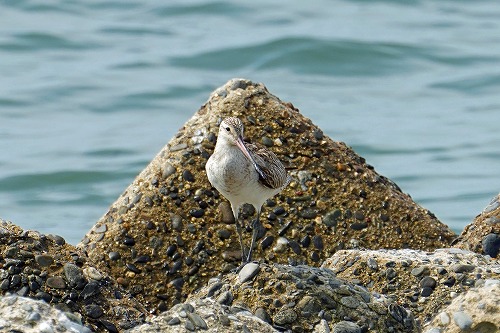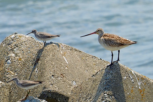 | 消波ブロックの上で、ダイシャクシギと。 腰のあたりかなり赤い。 |