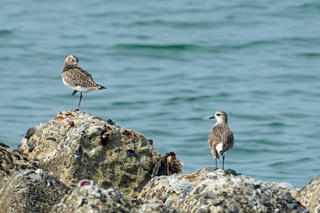 | 消波ブロックの上で休憩中。全長 50-60cm | 1羽だけ。シギがもう少ない時期に。 |