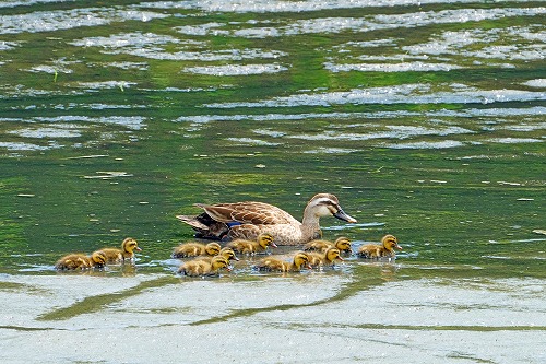 | ひなが10羽いる大家族。全長 58-63cm | ひながまだ小さい。成鳥になるのはそれほど多くない。 |