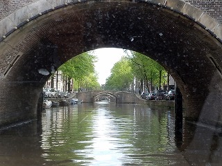 アムステルダム運河クルーズ 運河に架かる同じような橋が重なって見える 場所 |