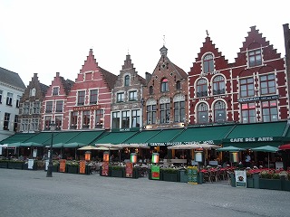 | ベルギー ブルージュに到着 夕食のレストランの 窓からマルクト広場 |