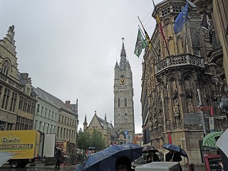 フランドル地方へ向かう時にはバスの屋根を 叩く大粒の雹には驚いた。 ゲントに到着しても雨が残って暗い。 奥にベルフォート(鐘楼)が見える。 |