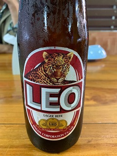 3日目の夕食 LEOビール。大ビンが120バーツ(480円)。 タイで人気のビールはSINGHA、Chang、 それにLEO。 |