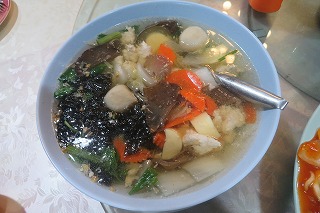| 5日目の昼食 きし麵の様な幅広麺に具入りスープを のせる。 |