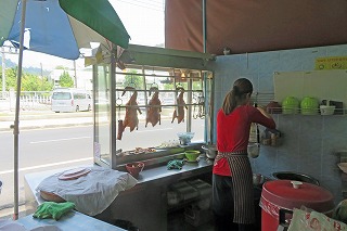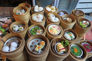 3日目の朝食 飲茶料理の店で材料が並んでいる。 |