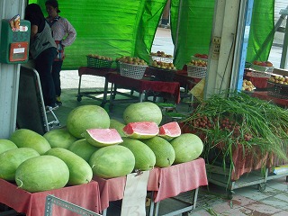 果物屋 豊原で高速を下りて、大雪山方面へ向かう。 スイカの他モモ、ライチを売っている。 ライチを一束買ったら旅行の最後まで 残った。 |