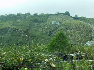 果樹園 山地にさしかかると斜面は果樹園。 今はナシの袋が目立つ。 |