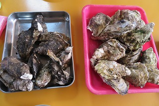 | かきが山積み | 焼きかき(左)と蒸しかき(右) 両方食べてみるが、どちらが美味いか? 甲乙つけがたい。 |