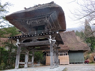 | 明善寺鐘楼門 1801年に建てられた。 岐阜県指定有形文化財。 茅葺の鐘楼門は全国でも珍しい。 奥には明善寺本堂 |